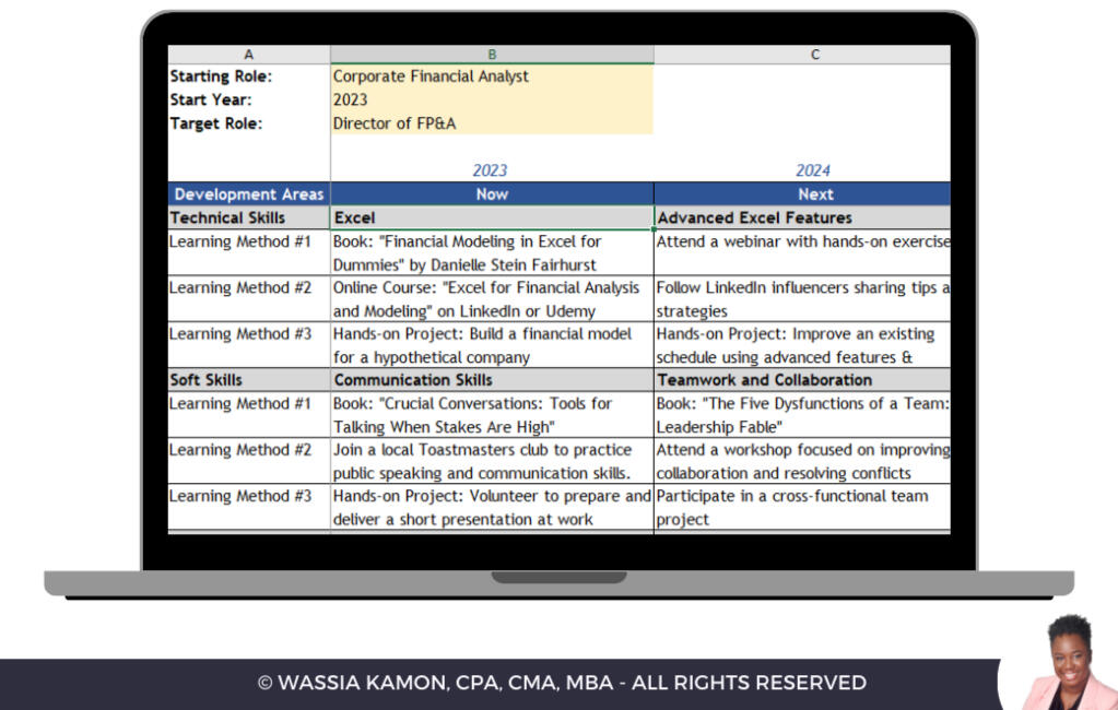 Plus, it comes pre-filled with sample 5-year career plan for a Financial Analyst targeting a Director of FP&A role.